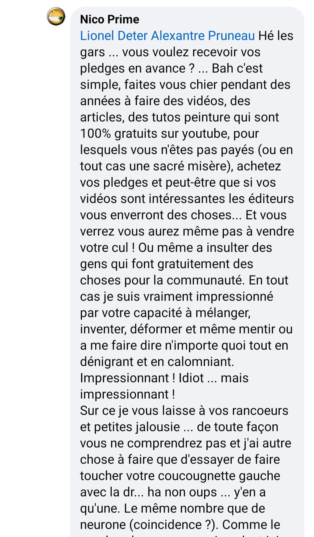 Je l’ai fait dégoupiller en 2 messages plutôt respectueux (surtout vis à vis de ses réponses), en demandant juste s’il avait reçu le all-in gratuitement de MG (il dit l’avoir payé et la rançon également), et en lui demandant d’expliquer pourquoi d’après lui il avait le privilège de recevoir son pledge en « exclusivité », qui a sûrement coûté plus cher à rapatrier aussi rapidement alors que les autres boîtes sortent à peine de l’usine et que des backers qui n’ont pas payé la rançon ne recevront pas du tout le jeu.