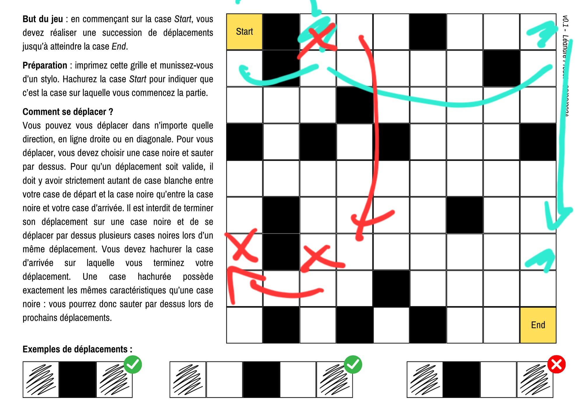 Contrairement aux labyrinthe traditionnels, tu ne peux pas partir de la fin puisque la configuration de ton labyrinthe va évoluer en fonction de tes déplacements ! En gros, pendant tes déplacements, tu vas pouvoir créer des cases hachurées (même caractéristiques que les cases noires) par-dessus lesquelles tu vas pouvoir sauter !
