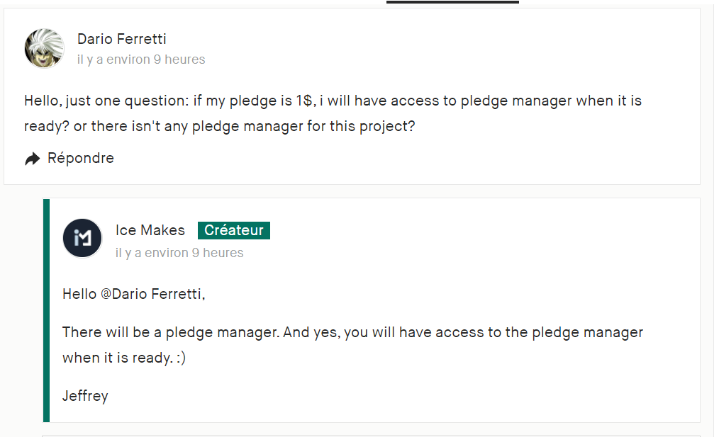 Ils ne précisent pas si les tarifs seront les mêmes cependant (Ike tombé sur de plus en projets où les tarifs sur le PM ne sont pas les mêmes pour un pledge de 1$/€ et les pledges « normaux »