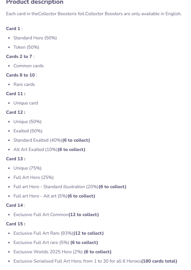 -des boosters collectors de 15 cartes. On n’a pas encore le détail, mais dedans il devrait y avoir des cartes entièrement full-art, les héros avec illustrations world ou alt-art et d’autres choses (c’est une supposition que je fais)