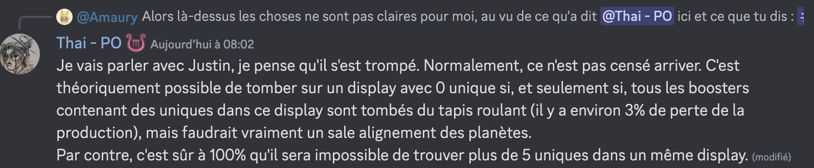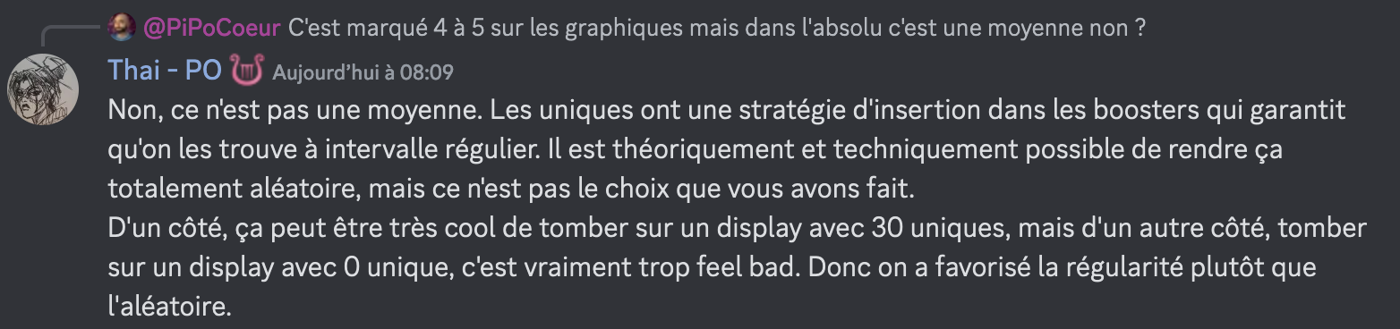 En gros pour moi l’un des principes d’un tcg est de fonctionner sur les probas. Les SG de ce KS sont totalement dans cette logique et sont incompréhensibles (et pas mensonger) si ils sont abordés sans comprendre ces notions de proba. J’ai cru comprendre dans les commentaires de campagnes que certains financeurs souhaitent des explications de ce type avec des vues graphiques des probas qu’on sort ici.