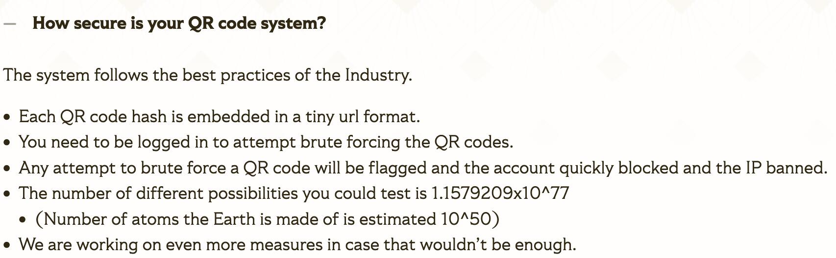Pour ceux qui comprennent pas l’anglais: ya plus de QR codes possibles que d’atomes dans l’univers sur Terre. Donc la proba de trouver un QR code qui correspond à une carte imprimée mais pas encore scannée est ultra ultra uuuuuuultra faible. Et si vous essayez quand même d’en générer plein et scanner, vous allez tenter tellement de QR codes qui n’existent pas que votre compte sera bloqué rapidement.