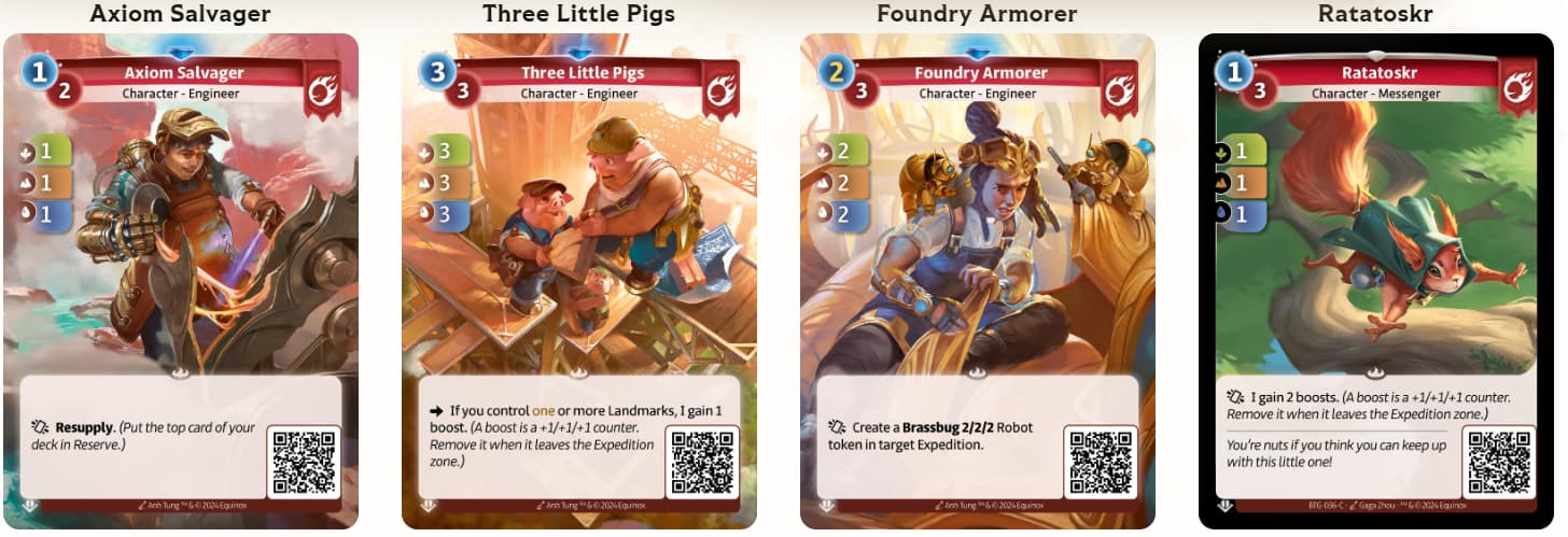 Pour Lyra, en regardant le starter, on voit quand même qu’il y a des cartes qui jouent avec les jets de dés. Trop peu pour un deck, à mon goût (2 cartes, en 1 exemplaire chaque…), mais ça ouvre des possibilités de build sympa. (Un permanent permet de lancer un dé de plus, et d’ignorer un résultat, et un perso gagne un boost chaque fois qu’on lance un dé pour quoique ce soit.)