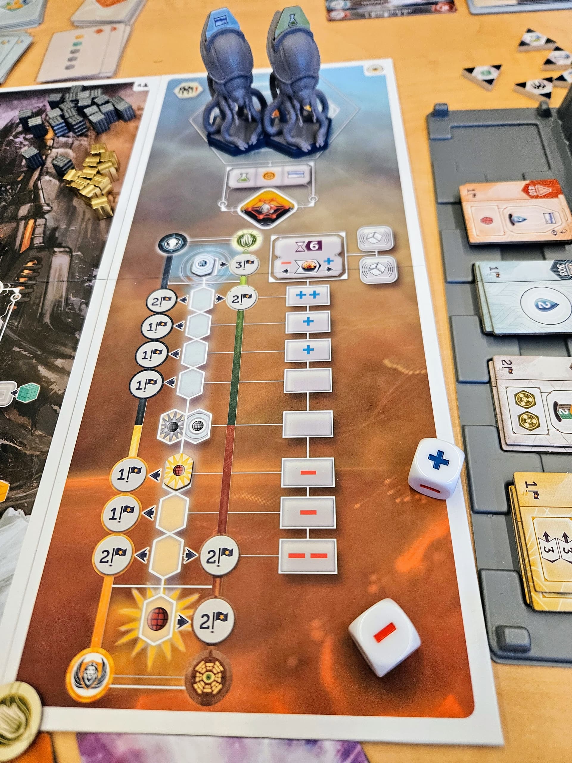 Du coup, à chaque étape 6 de manche, on lance des dés pour voir si l’impact se produit plus tôt ou plus tard. Comme les « sauveurs » ont gagné, l’impact n’a pas eu lieu du tout !!! Cassant en deux les stratégies d’évacuation habituelle qu’on peut avoir à Anachrony. Résultat, score pourrissimal d’une 30aine de points pour moi ![]()
