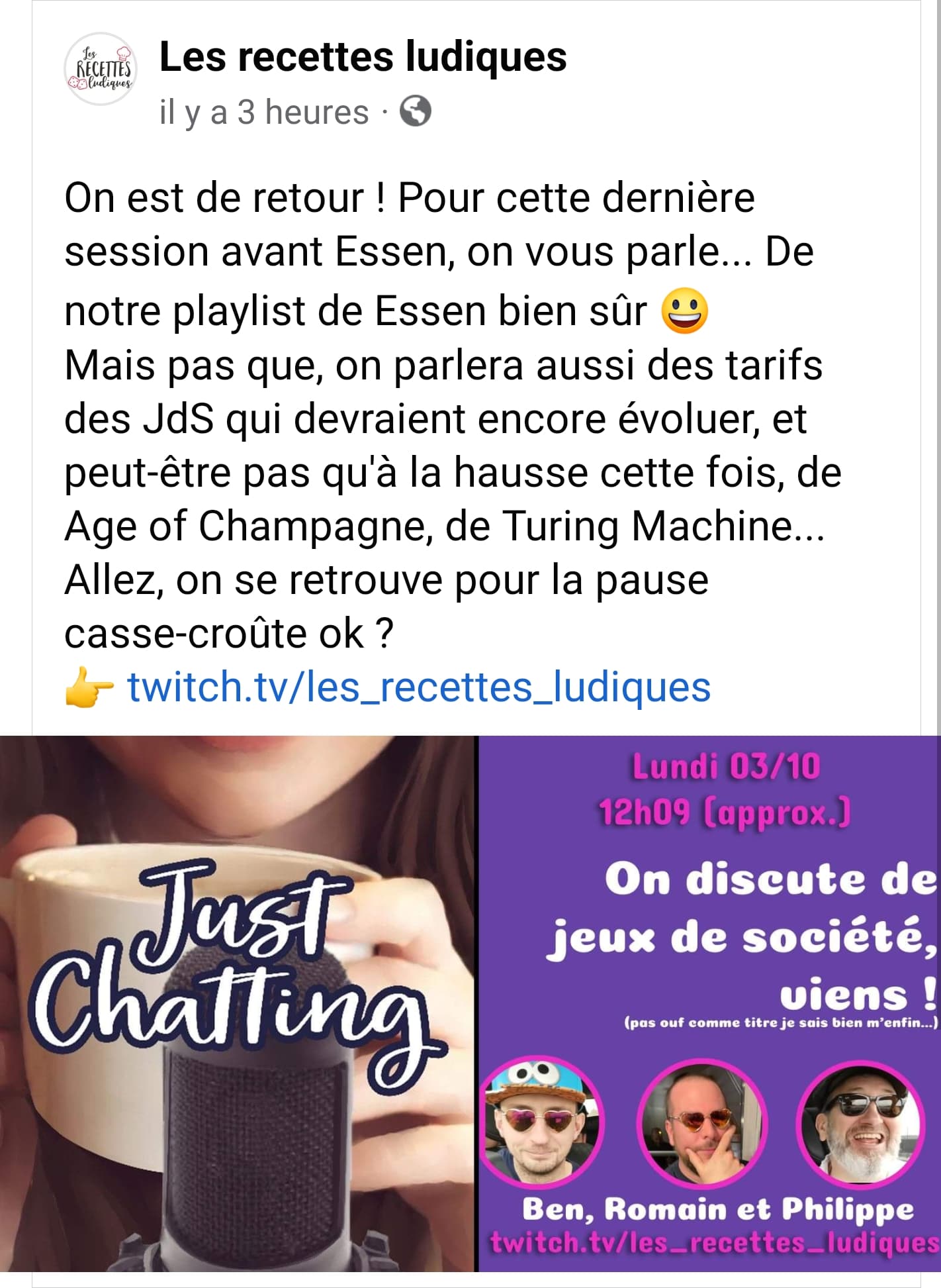 Demain (ce Lundi) pendant votre pause déjeuner vers midi, prêtez une oreille à la chaîne Twitch des RECETTES LUDIQUES… Les 3 compères Ben, Romain et Philippe devraient, entre autre, échanger leur avis sur AoC.