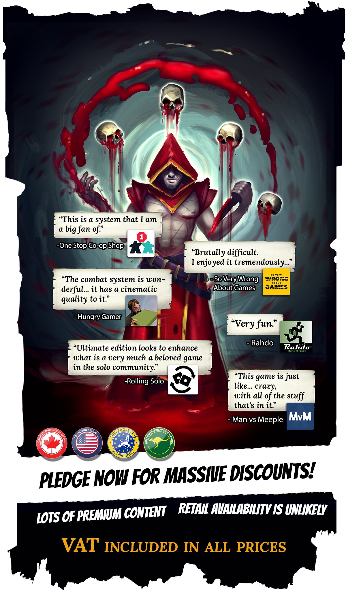 Sinon, 23€ de fdp, soit 100€ tout pile avec un pledge de base, 114€ avec un intermédiaire (pour ceux qui veulent rajouter le solo), et 140€ pour le Roguelike.