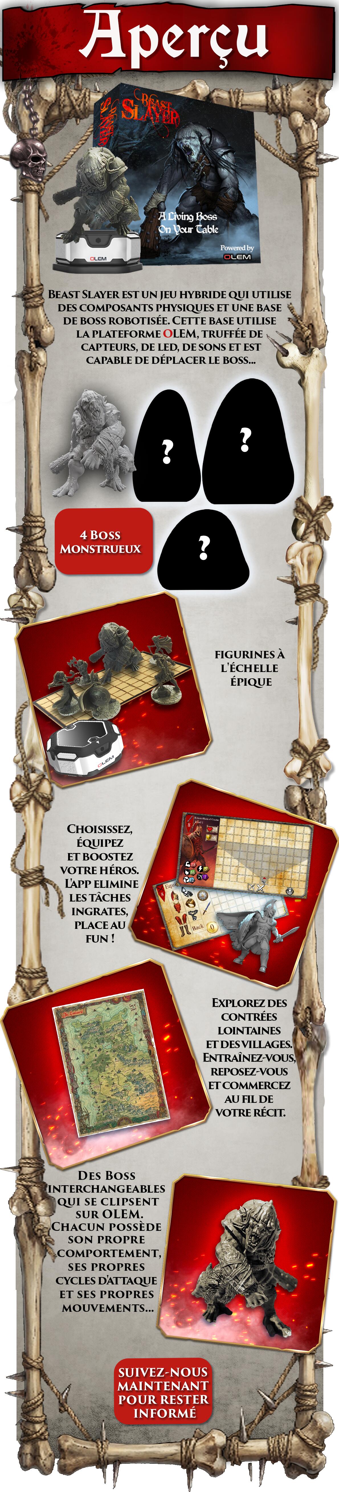 « Dans Beast Slayer, vous explorez un univers riche avant d’affronter des boss gigantesques montés sur une plateforme mobile entièrement interactive et équipée de capteurs. Rassemblez vos héros, emparez-vous de vos armes, puis attaquez, défendez-vous et déjouez les quatre capteurs du boss — à l’avant, à l’arrière et sur les côtés. Le boss réagit de manière dynamique : des LED clignotent en rouge lorsqu’il est blessé, il titube, riposte ou lance des attaques spéciales en se déplaçant et il vous hurle dessus ! L’application gère les aspects techniques (dégâts, soins et effets) afin que vous puissiez vous concentrer sur les tactiques héroïques et les affrontements cinématiques. Vous pouvez disputer des combats de boss One-Shot ou jouer en mode Campagne, où vous plongez au cœur de l’univers et de l’histoire, et où vos choix ont un impact réel. Votre groupe triomphera-t-il, ou disparaîtra-t-il dans l’ombre de l’Empire ? »