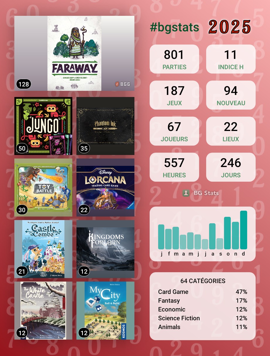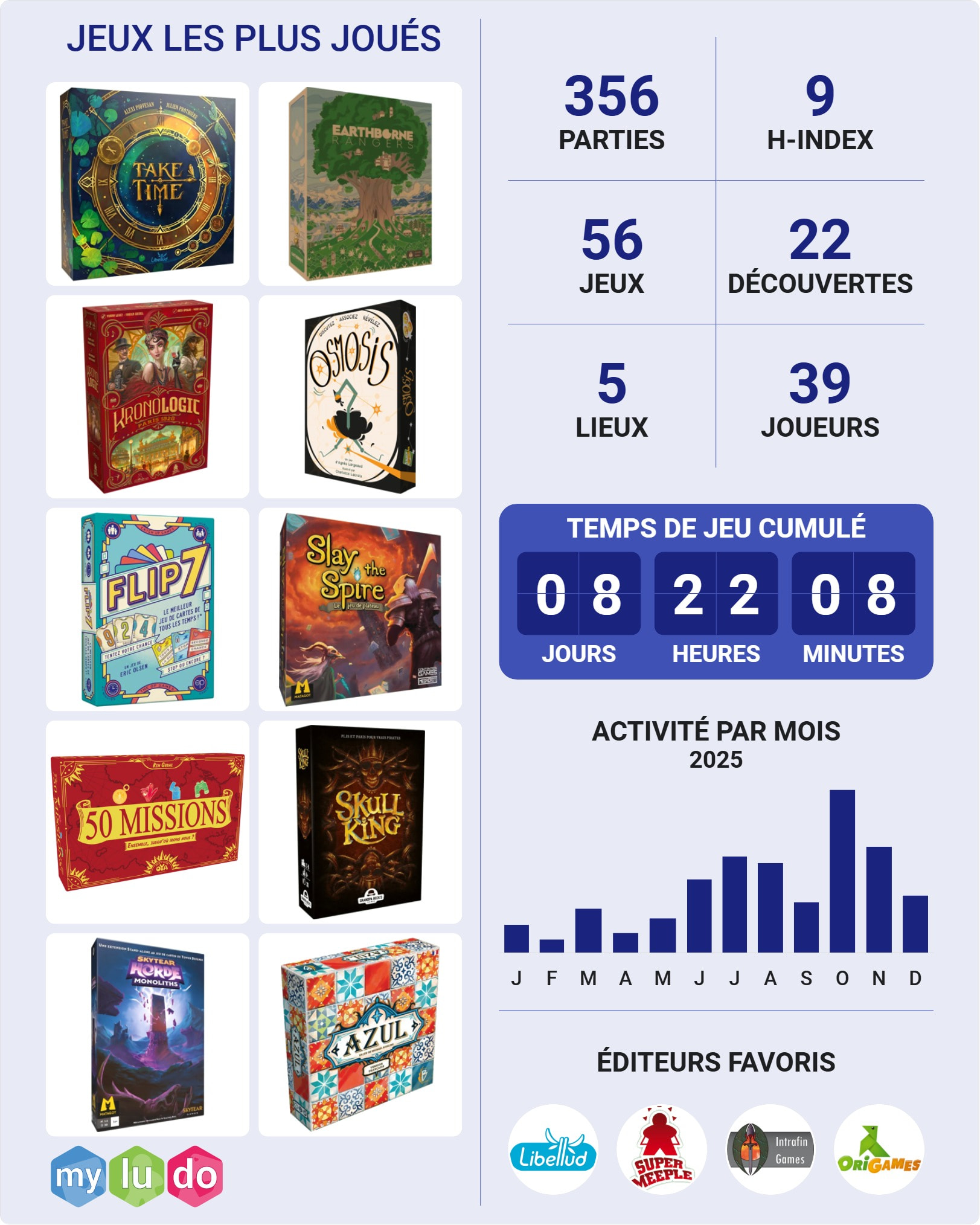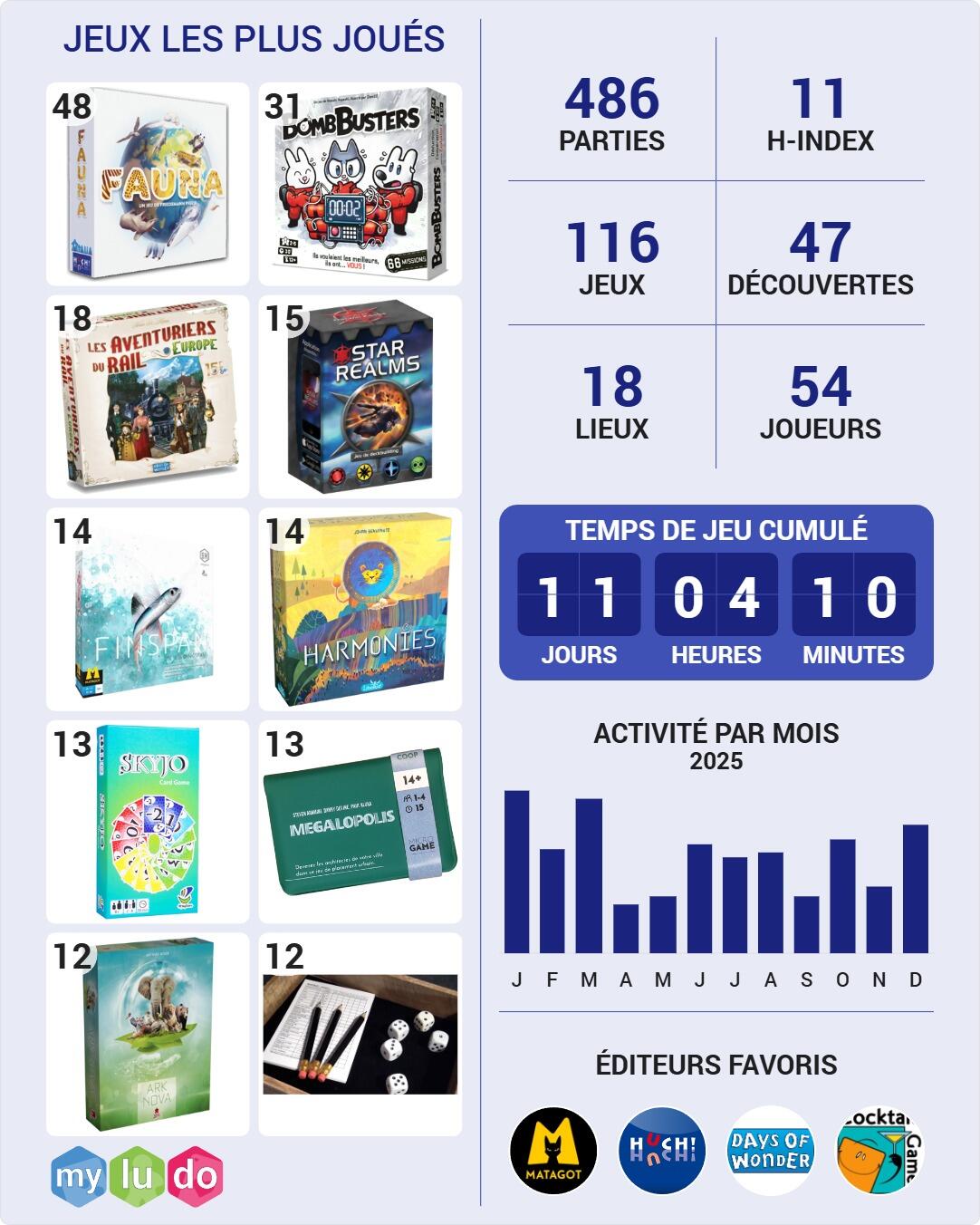 Le bilan est plutôt positif dans le sens où cette année mon nombre de jeux et mon temps de jeu ont augmentés significativement par rapport à 2024. La principale raison est que je joue de plus en plus avec n°2 qui, on peut le dire maintenant, adore jouer!