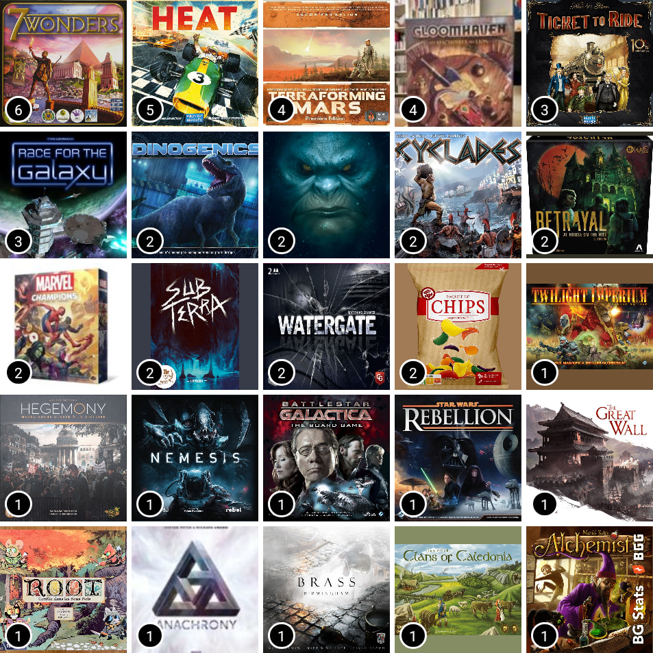 249 parties avec 26 joueurs différents, mais toujours un noyaux dur de 4 pour les weeks-ends Gentlemen (nom de nos week end jeux). Mes 2 joueurs habituels pour les soirées jeux, la famille et l’asso de jeux. Les enchainements de parties des petits jeux en soirée comptent en général pour 1! 20 parties de The Gang c’est =1.