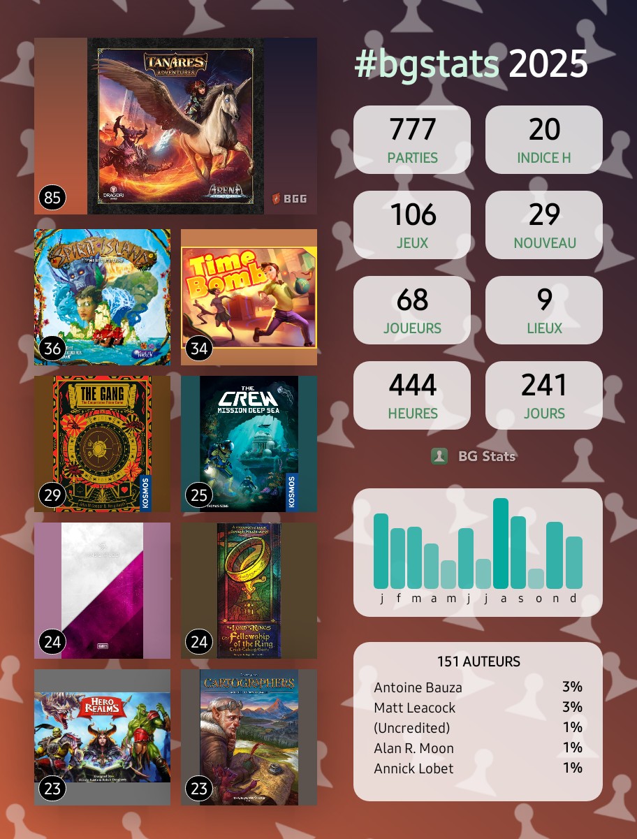 13 pledges ou achats boutiques reçus en 2025, dont 7 extensions/standalone ! Mais une liste de jeu en attente qui n’évolue pas beaucoup car trop de craquage : je passe de 16 à 15 jeux en attente (dont 3 extensions) !! Mais 8 vont arriver d’ici mars !!