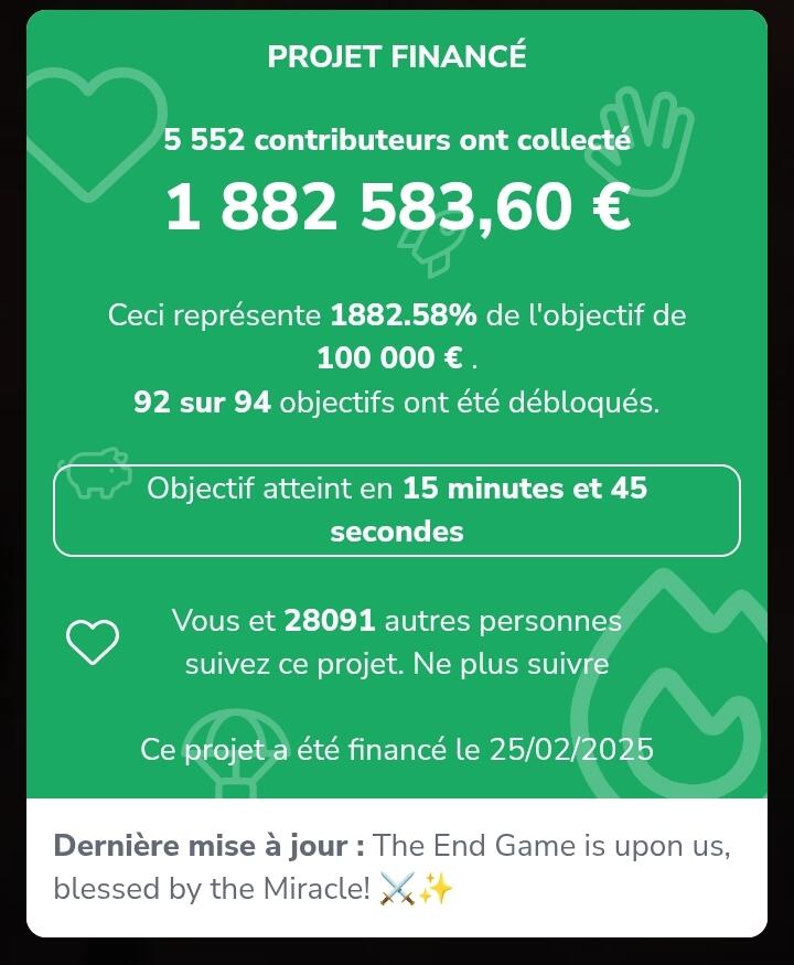Campagne + Endgame qui s’est finalement fini à 5h00 du mat. 1.88M€ (2M$) pour 5552 backers. Très beau score au final. Et un T-shirt