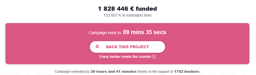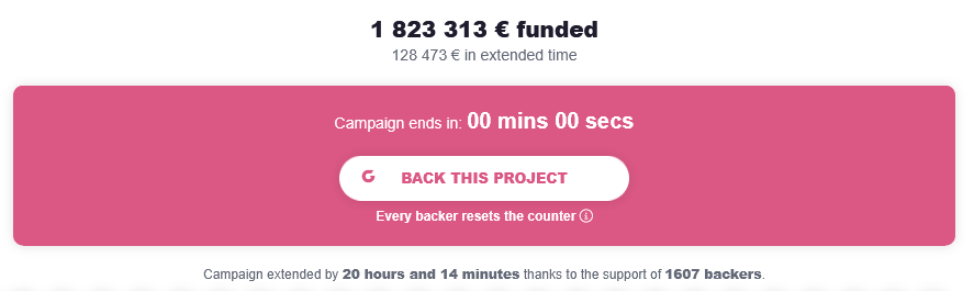 On est passé à +120k et +1400 backers, c’est beaucoup pour une campagne qu’était censée être terminée. (même si je pense que le nombre de backers est biaisé car c’est ceux qui ont permis de reset le timer mais pas forcément des newcomers si ?)
