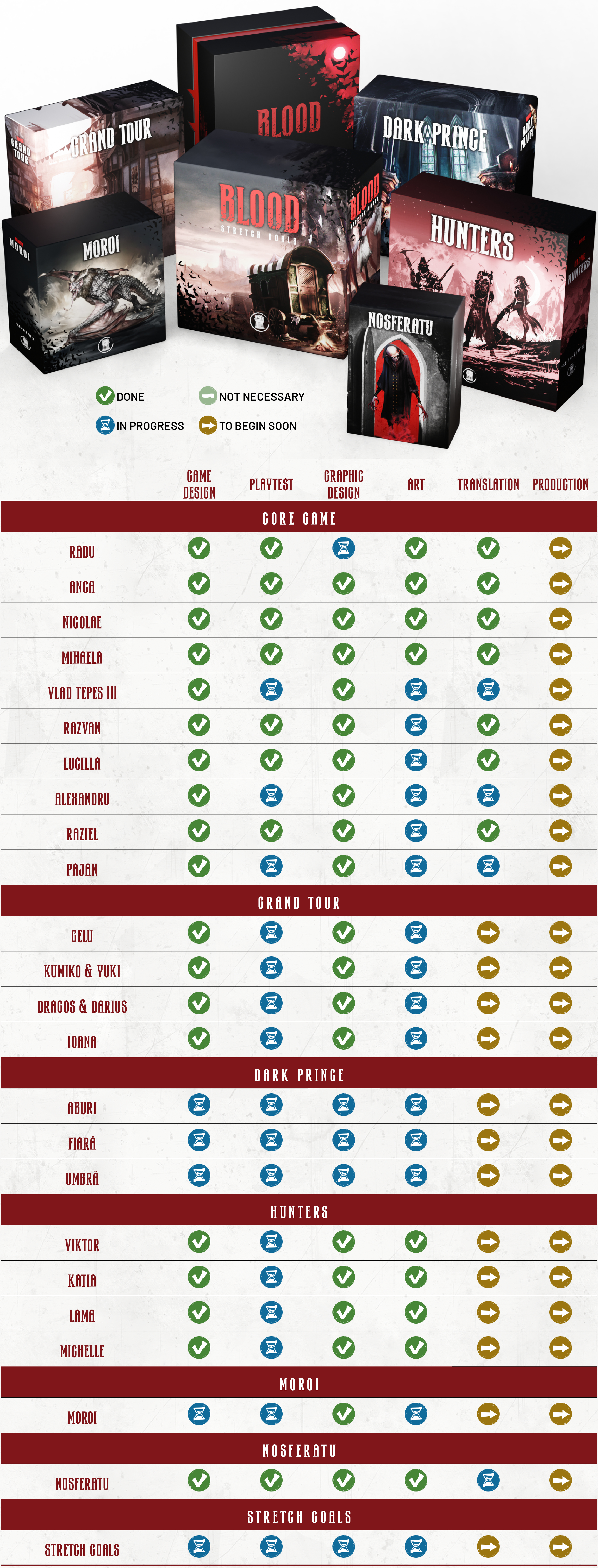 This is also a request that many of you have made, and we felt it was right to give you more time to decide on your purchases. We are discussing with the factory about the timing for the start of production, based on the progress of development, the production of the print files, and the production of the molds for the miniatures, in order to provide you with a new closing date for the Pledge Manager. In the July update, we will be able to give you the new date, but in the meantime, we are sharing a table with you so you can better visualize the status of the work on Blood! We will continue to update it in all future updates so you can follow all the next steps with maximum transparency!