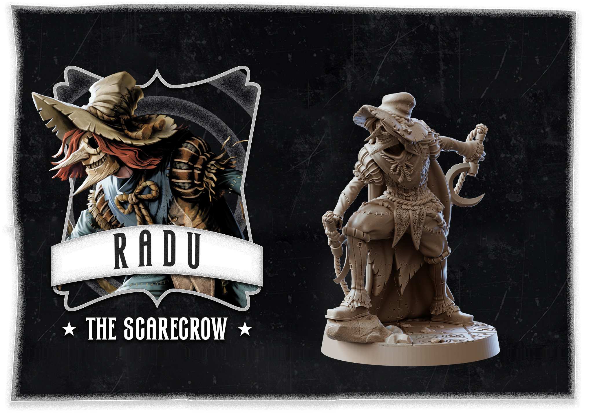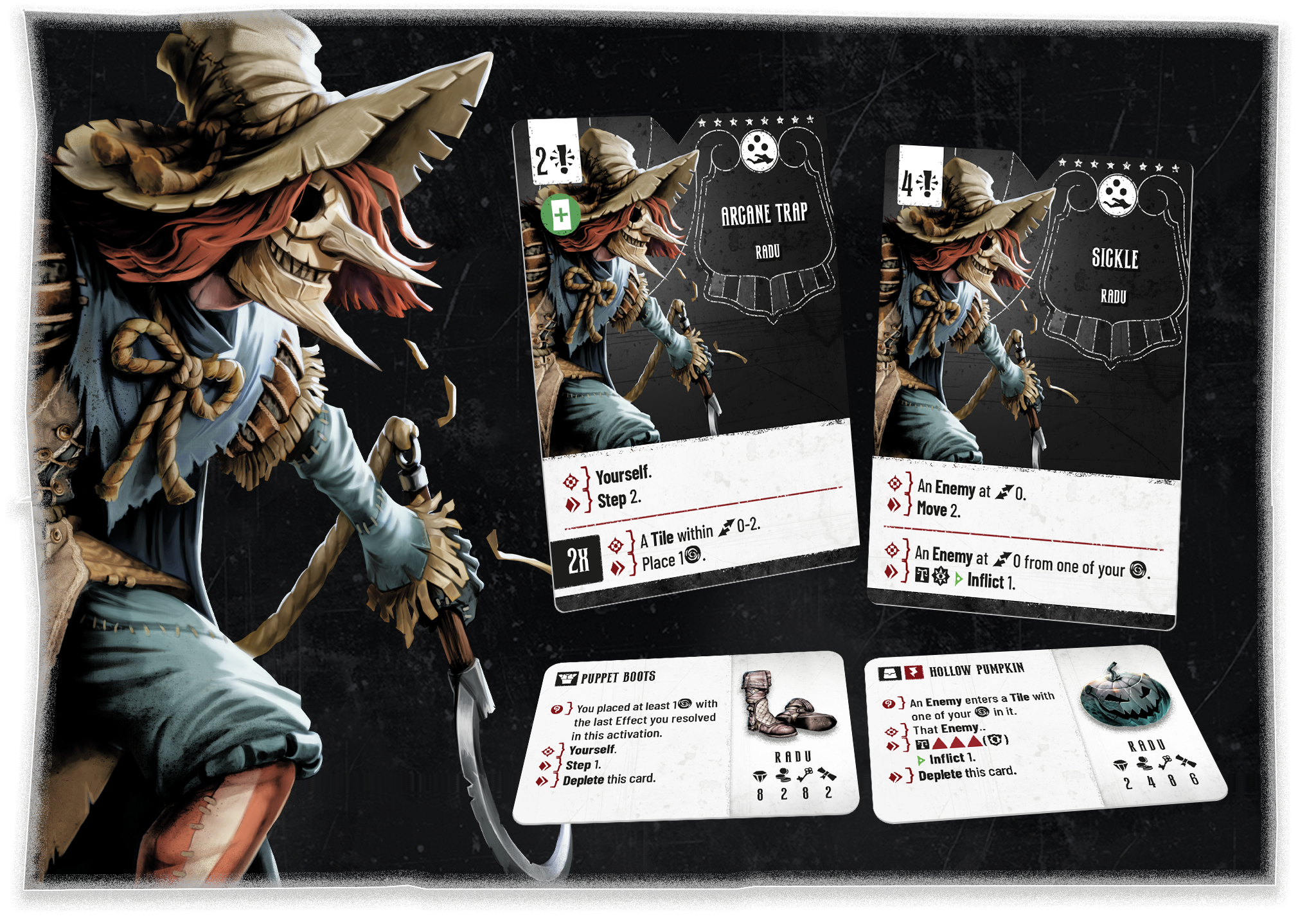 Radu is a fast and tactical Trouper, designed to move with agility and dominate the battlefield through the clever use of Whisper Tokens, traps that he scatters across the map. His Starting Tactic Cards allow him to move quickly and place these tokens strategically, creating an invisible network ready to activate against anyone who dares to approach.
