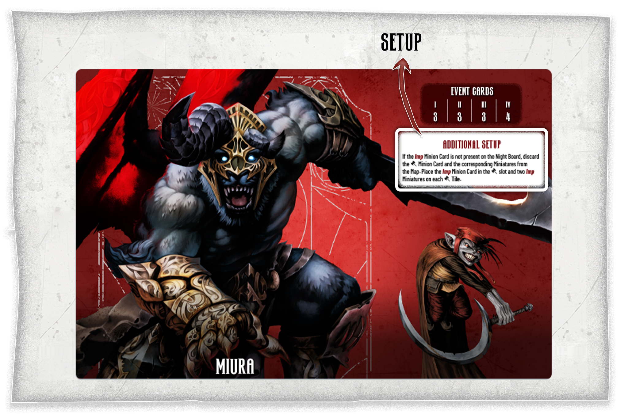 The back of its Nemesis Card instructs us that during its setup, one of the two Minions that will participate in the battle against it must necessarily be the Imp. Clearly, our burly vampire has a particular synergy with this type of minion, and with experience, you can use this information to your advantage.