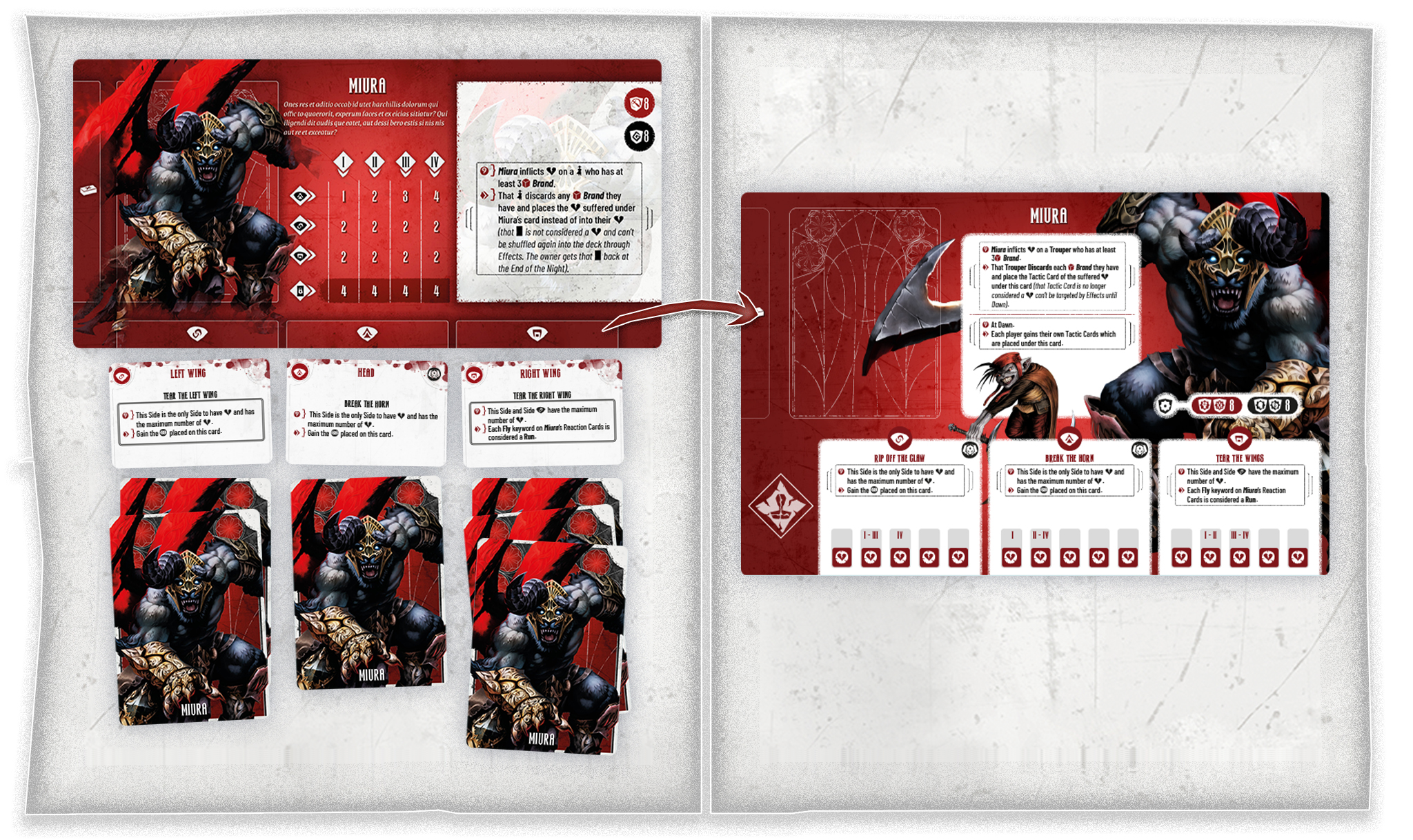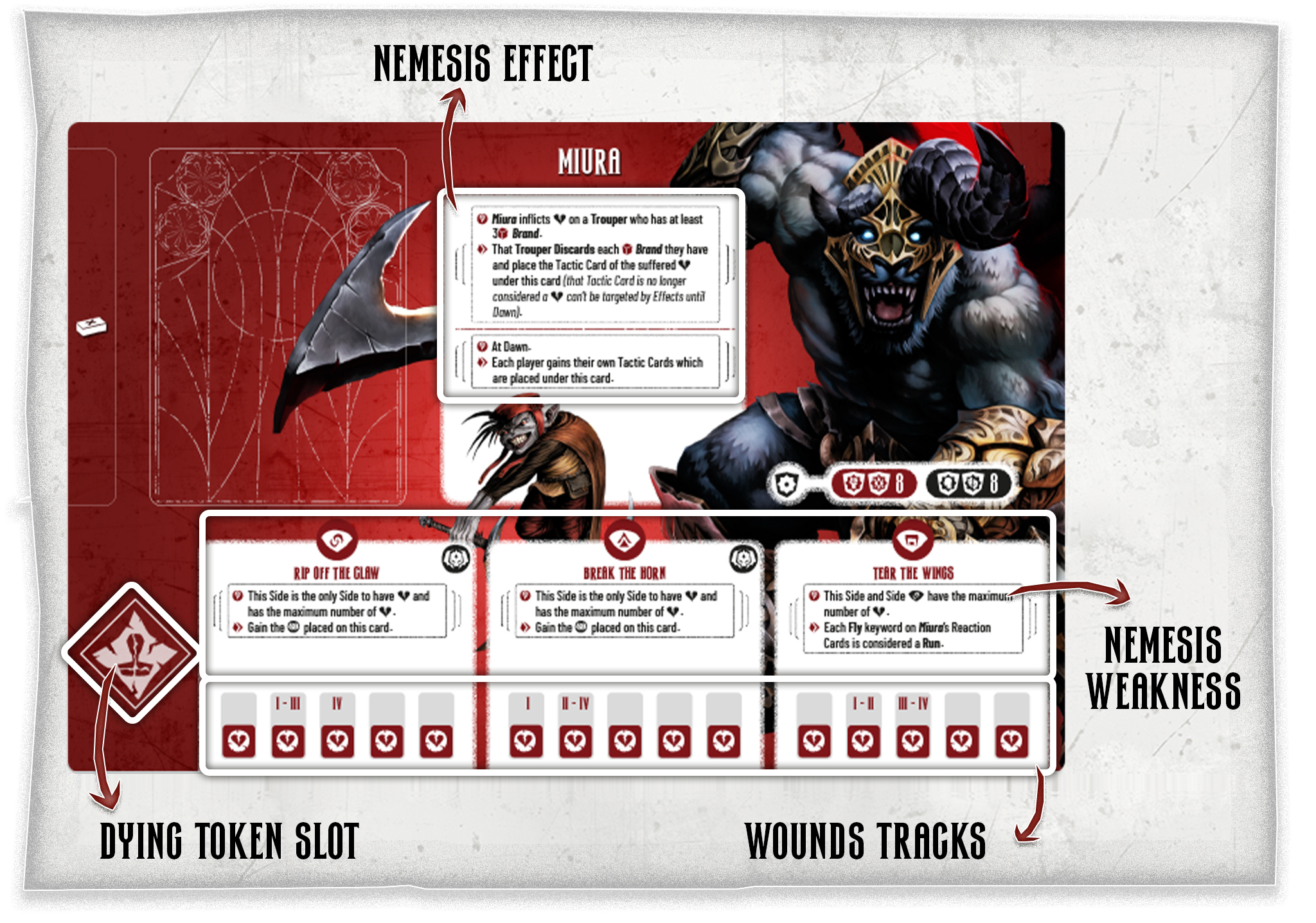 To give you a practical example, let’s take a closer look at Miura’s Nemesis Card, one of the fantastic Nemeses added to your pledge thanks to the Stretch Goals!