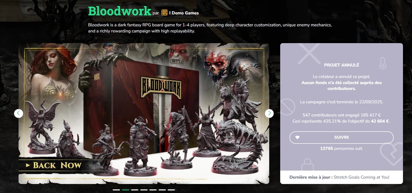 Un gars indique qu’il n’a pas confiance en leur projet du fait de plusieurs points rappelant trop LSG (DA, figurines, financier extérieur, il argumente un peu quand même) et que cela nuit à leur campagne, moi j’en rajoute une couche en expliquant qu’avec 200 000 balles tu ne peux pas produire ce jeu. On supprime nos commentaires (loin d’être haineux ou vindicatif contrairement Amarice leur employée masquée) et BIM ! Campagne annulée … ridicule.