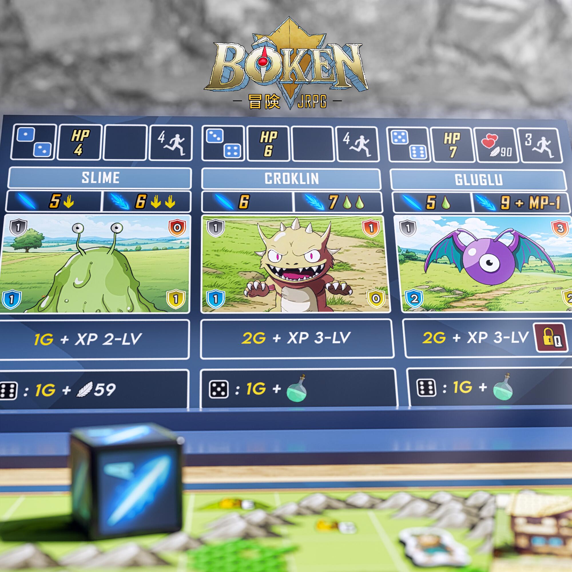 Il y a un dé spécifique de déplacement qui permet de se déplacer sur la carte. Ce dé était le meilleur moyen pour retranscrire les déplacements des anciens DQ ou FF, car la distance que l’on peut parcourir avant un combat est aléatoire. Donc, dès que l’on s’arrête sur une case de terrain, une rencontre (combat) liée à ce terrain se déclenche. Il reste néanmoins l’option fuite et les champi-flash qui sont des items pas cher que l’on peut acheter partout et qui nous permettent de fuir automatiquement un combat.