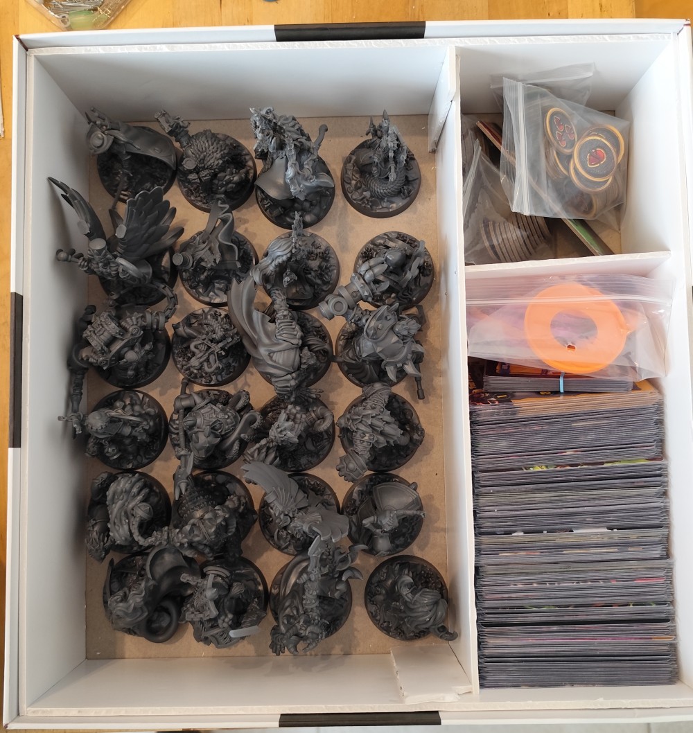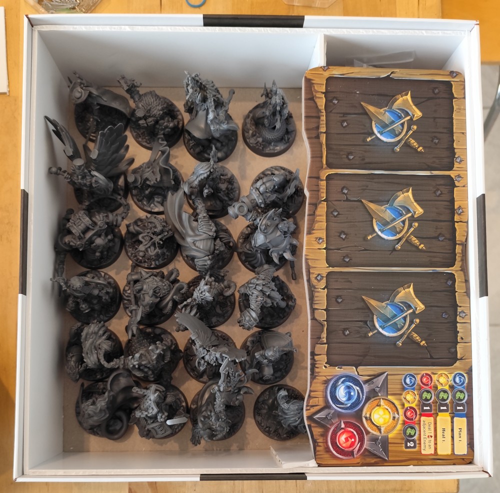 Au final, voilà ma solution : tout tient dans une boîte de même format que SFB mais qui fait juste 2,5 cm de plus en hauteur pour mettre les figurines debout dedans. Ça tient sans trop forcer; il faut d’ailleurs que je fasse des intercalaires pour faciliter la sortie des cartes.