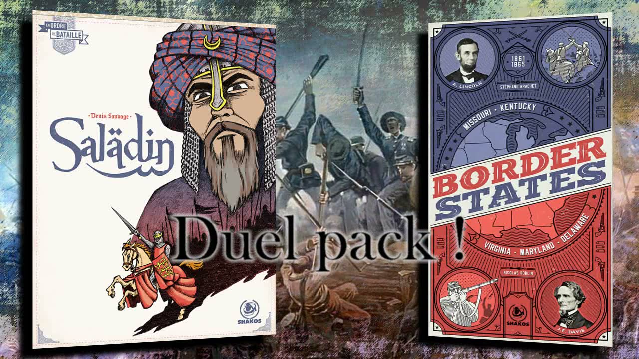 Deux petits jeux historiques pour deux joueurs : Border States, une lutte d’influence entre abolitionnistes et esclavagistes pour le contrôle de 5 Etats américains indécis, et Saladin, simulant les batailles de Hattin et d’Arsuf où Saladin affronta les troupes croisées.