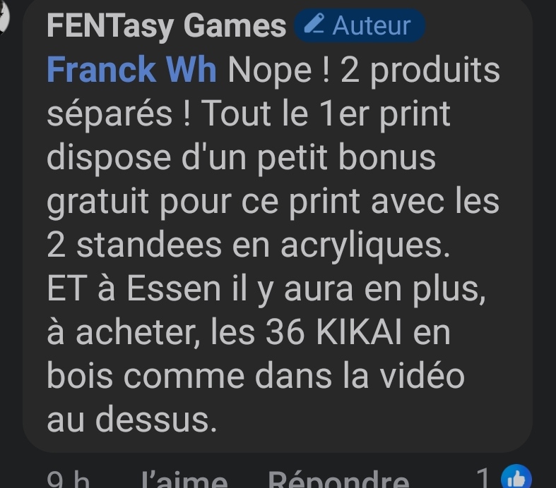 On est pas sur un asmodee ou un gros éditeur on est sur une toute petite structure avec fentasy, deja il a trouvé comment faire des kikais en bois a moins de 90€ (j’en etait la dans mes recherches perso). Donc 35€ c’est quasi le prix du jeu est ce que vous auriez ajoute ce prix la en plus sur un jeu en preco?