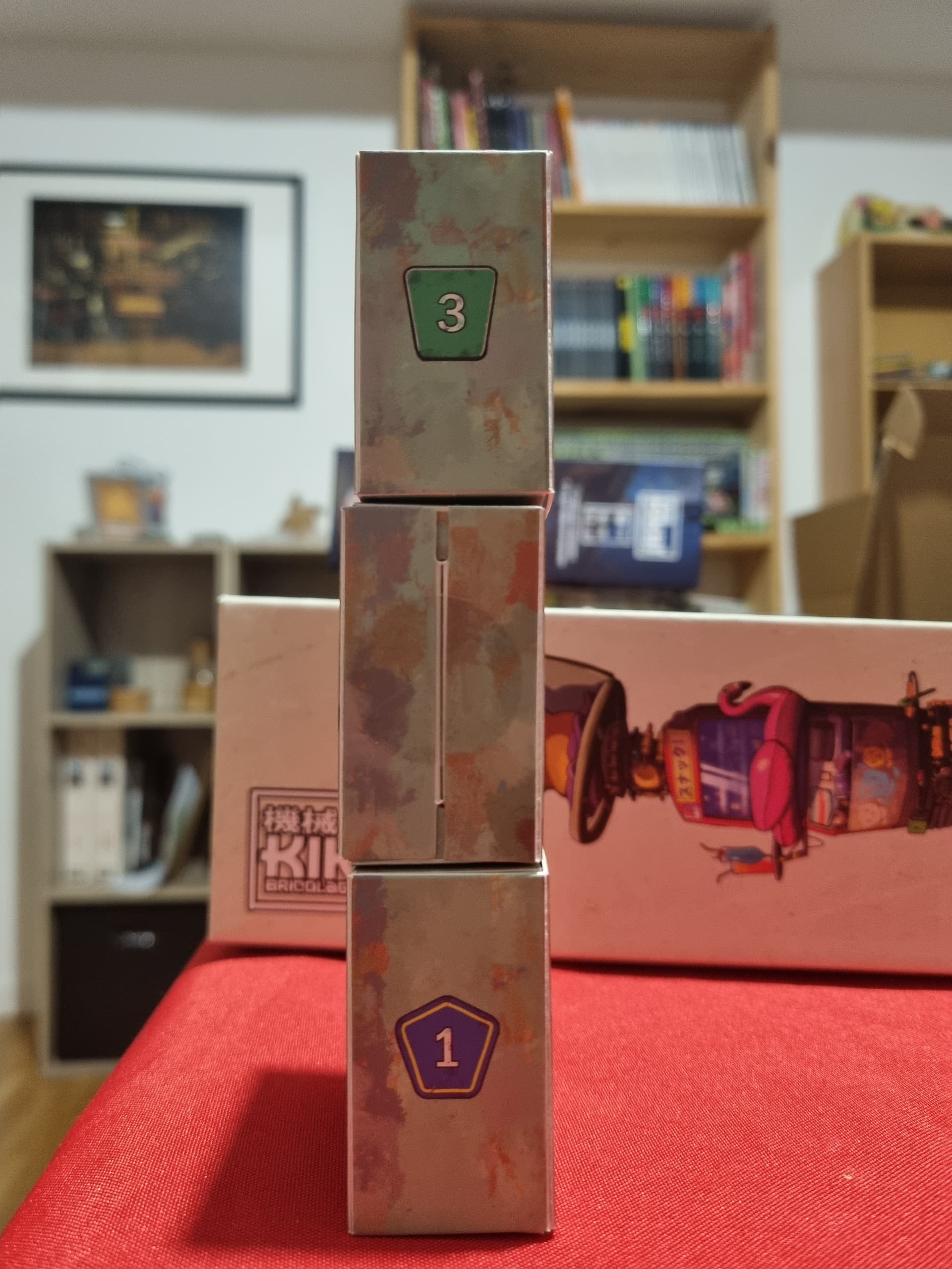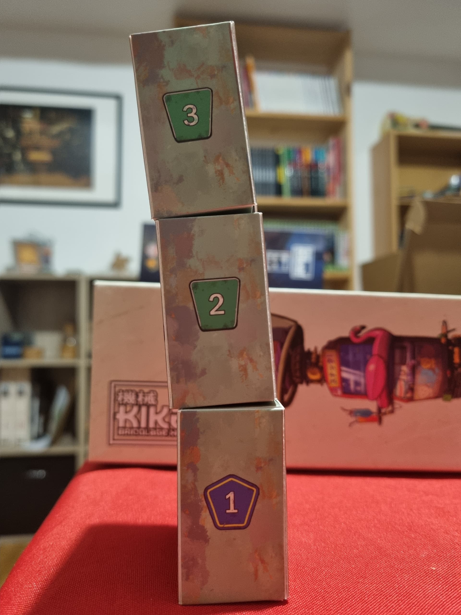 Je suis curieux de voir si les cubes de la VF sont les mêmes que ceux de la VO, parce que moi en une dizaine de partie, on a jamais galéré pour les empiler, et rien n’est jamais tombé. Ce n’est pas vraiment carré, mais les pans se replient vers l’intérieur, ce qui le rend plus stable, en s’empilant sur les autres