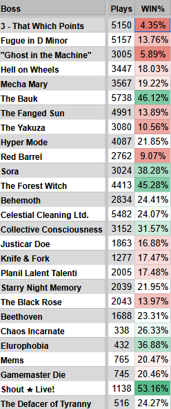 J’avais chopé un tableau avec les statistiques de victoire pour chaque personnage vs chaque boss.