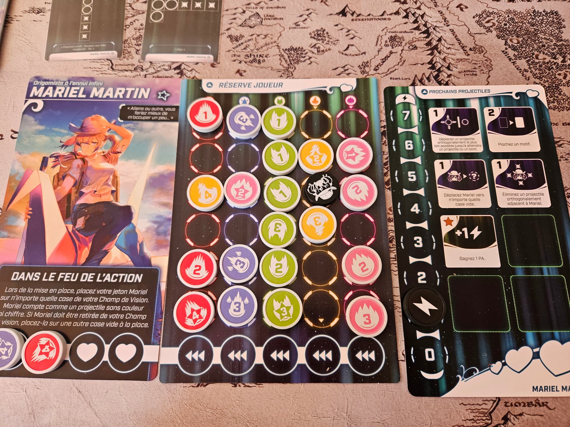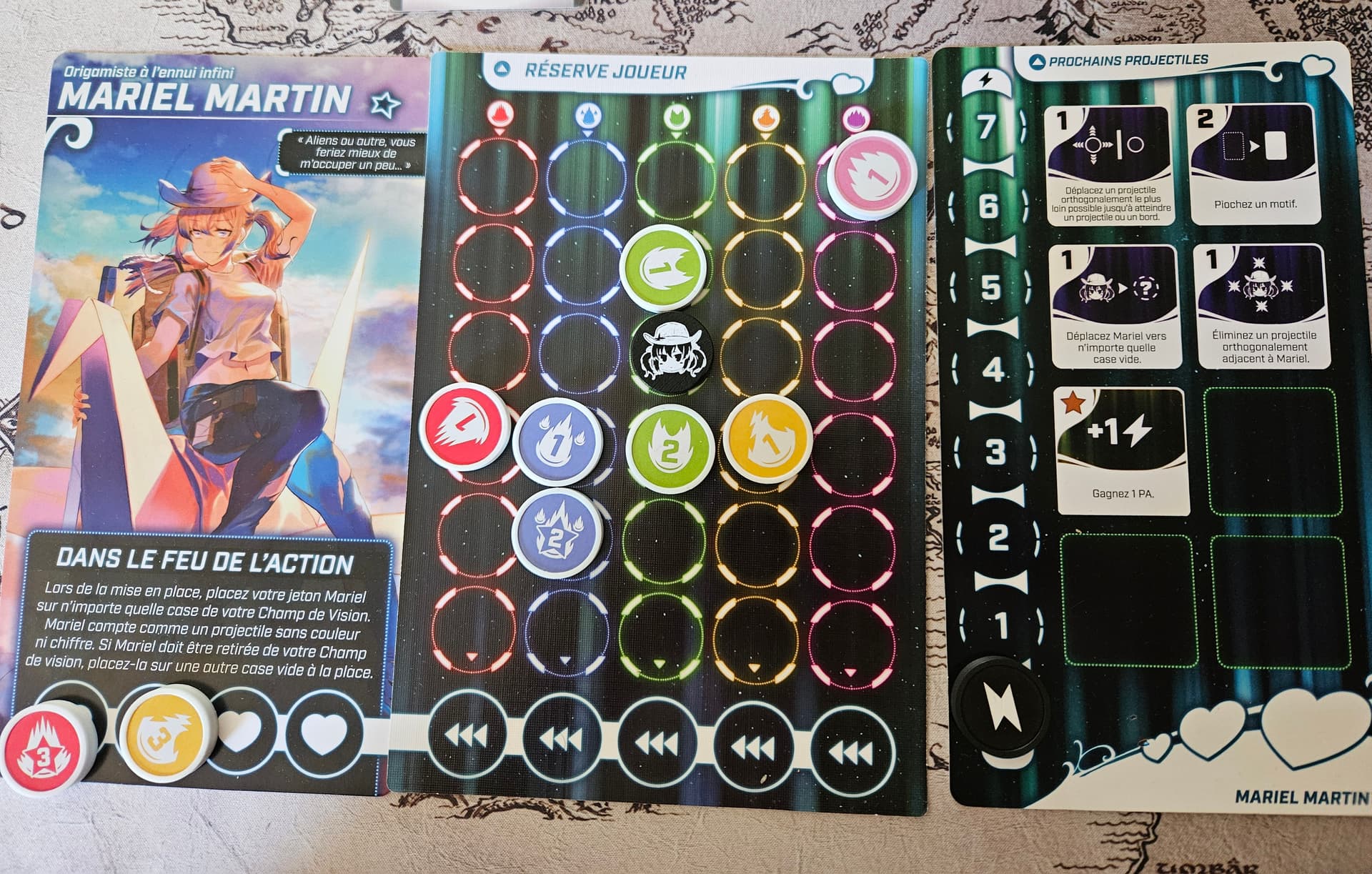 - Celle qui indique : Au final, elle a été beaucoup plus simple, car j’ai eu une partie avec peu de bullet 3, et j’ai pu les contrôler avec le pouvoir de Mariel si besoin. Il m’a fallu 6 essais pour la passer. J’ai bien nettoyé les 2 premiers tours (le 1er, j’ai même cleané le board). Le 3ème, j’ai vraiment fait du minimum histoire de ne pas exploser (c’est là où je prends mes 2 bullets à la pose d’ailleurs), et j’ai bien enchainé les tours 4 et 5 pour finir le jeu. ça aide bien de pouvoir faire sortir le jeton de Mariel !