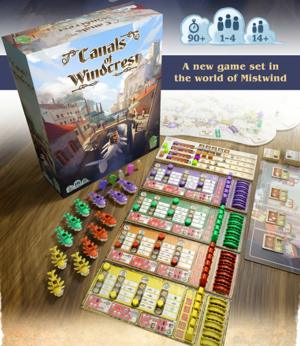 Dans Canals of Windcrest, les joueurs piochent des cartes de localisation qui leur permettent d’obtenir des ressources et des actions spéciales. Les ressources sont utilisées pour construire des ponts et des bâtiments, mais aussi pour fabriquer des biens destinés à l’exportation. Naviguez sur les canaux à bord de ferries volants en forme de baleines pour livrer les marchandises exportées tout en transportant des citoyens et des contremaîtres afin d’obtenir divers bonus. Les joueurs disposeront également d’investisseurs qui les aideront de différentes manières, notamment en leur accordant des pouvoirs spéciaux et des bonus de score en fin de partie.