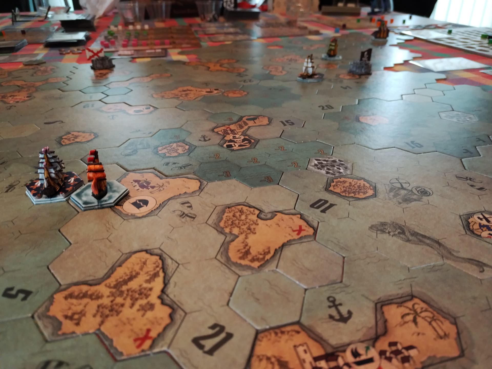 Le marché étant très pauvre en ressources en ce début de partie, on navigue plein gas pour explorer et récupérer des barils pour les revendre à vil prix au marché noir des 2 ports pirates qui, eux, sont sortis très vite.