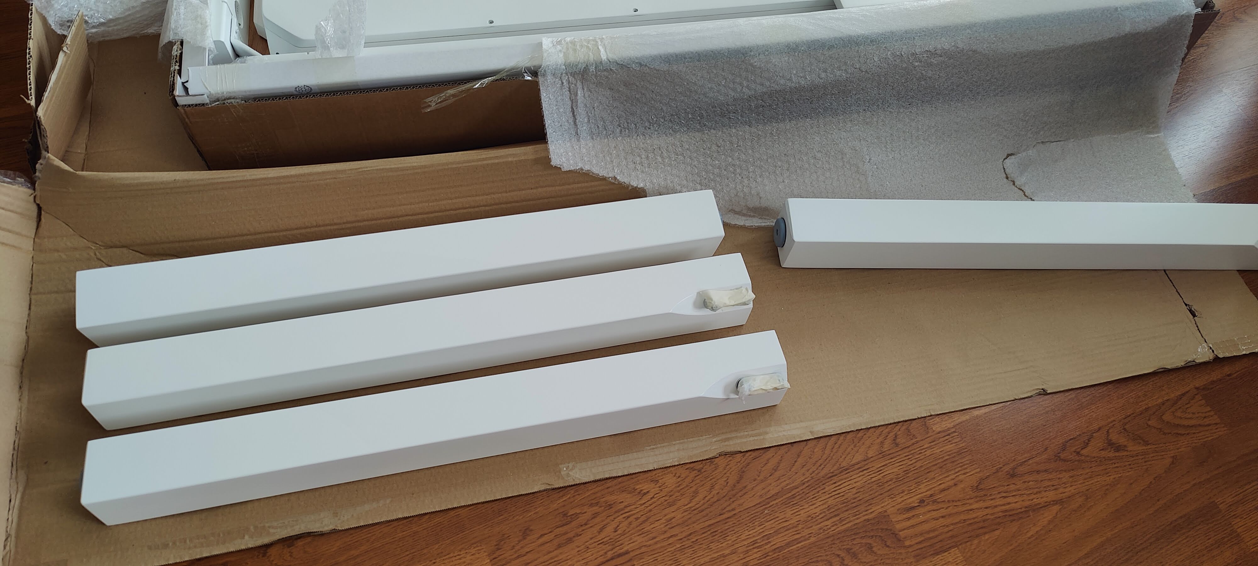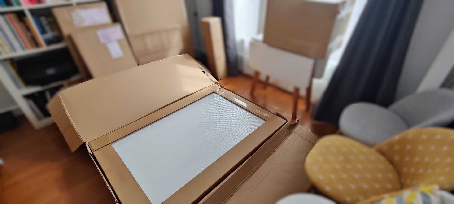 Un exemple avec l’emballage des pieds : cartons extérieur, puis coffrage de bois intérieurs avec les fameuses baquettes d’angles en papier/carton hyper rigides, avec papier bulle et filme de protection. Et encore un peu de scotch de peintre pour finir de protéger les arrêtes les plus saillantes. Avec c’est 12% du prix total mais bon, on comprend le temps passer à packager tout ça !