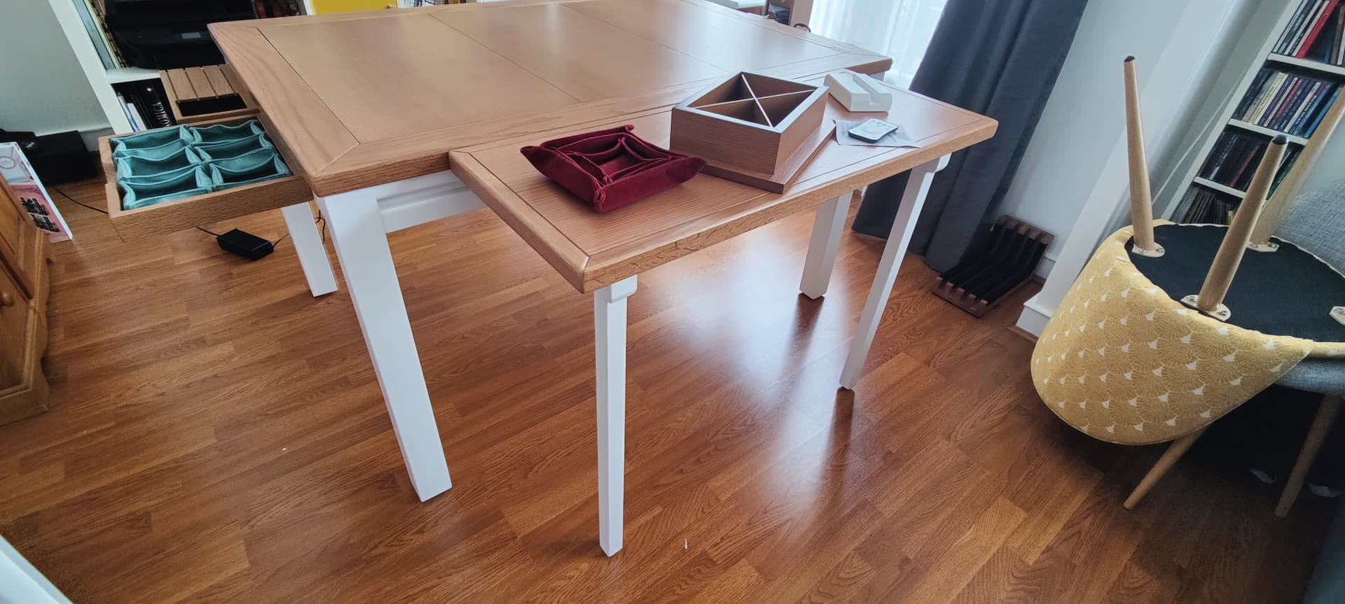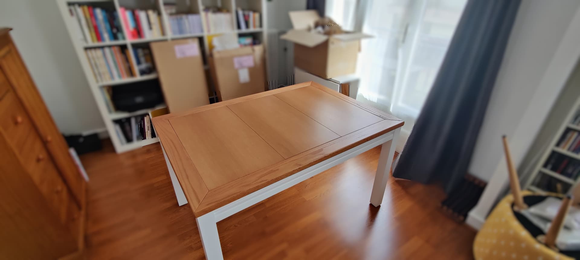 C’est pour ma part avec une petite salle à manger d’appartement une PROMETHEUS en chêne naturel sur la partie supérieurs et tous les accessoires, et en pin (peint en blanc) pour le socle et les pieds.
