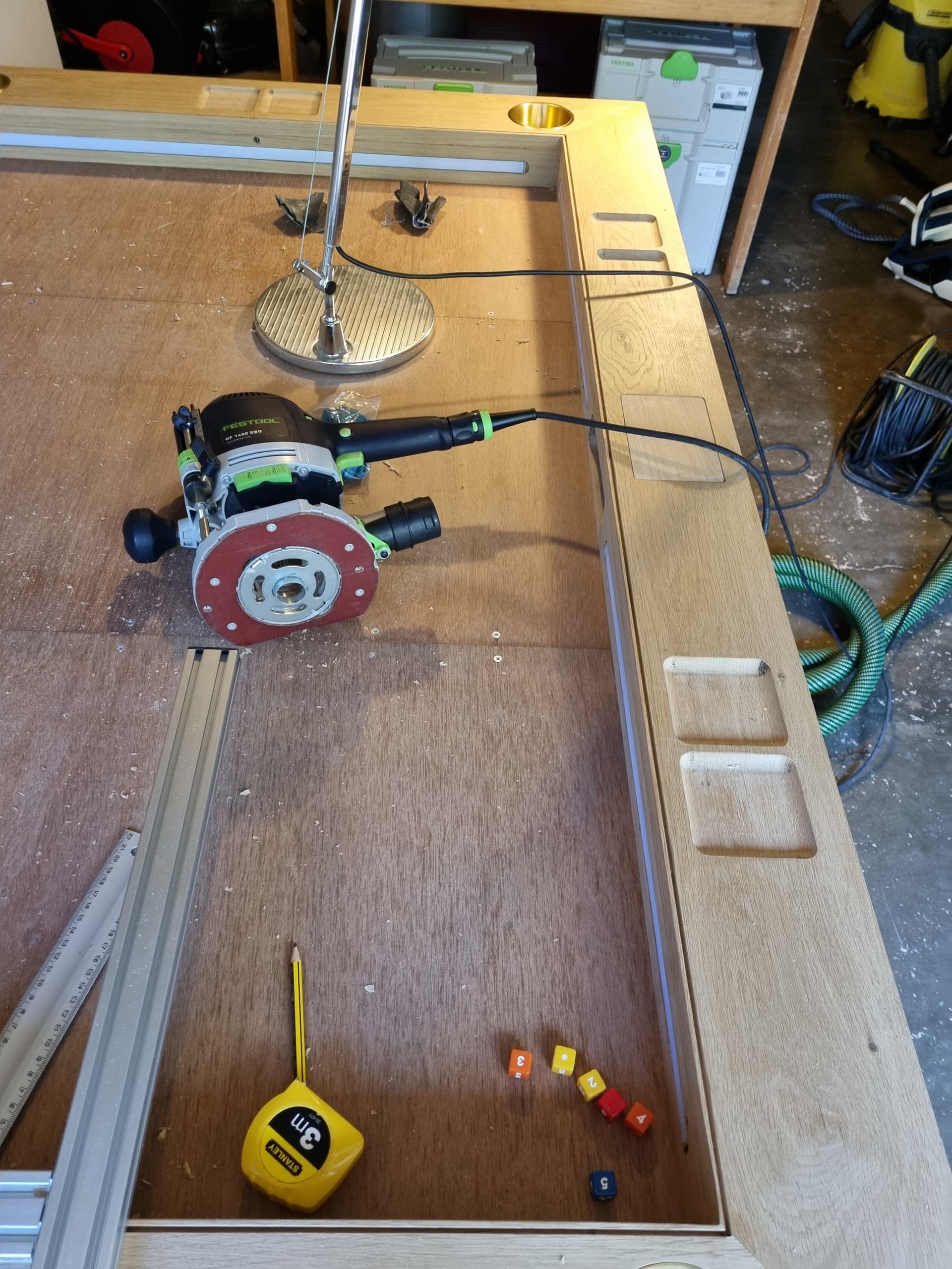 Alors j ai pris une fraise de 3mm (j’ai pas trouvé plus petit). Pour la profondeur, j’ai fait jusqu’à ce qu’une carte ne tombe pas quand on l’effleure +/- 8mm;)Puis j’étais limité entre le domino du dessous et le bord.