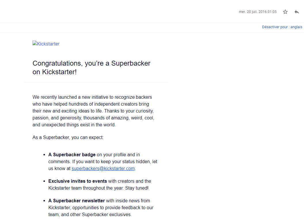 Je Stay Tuned pour les invites exclusives depuis 2016. (et les « autres » superbackers exclusives de la superbacker newsletter que je ne reçois pas)