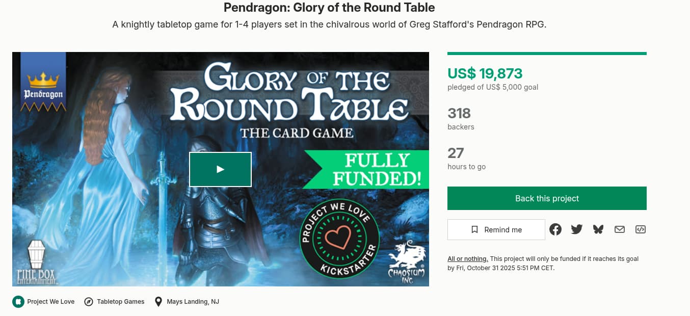 Le KS « Pendragon: Glory of the Round Table » se termine tout doucement… ça n’a pas déclenché les foules. J’hésite à pledger (je suis un peu collectionneur de tout ce qui a trait à Pendragon). Reste ~2J.