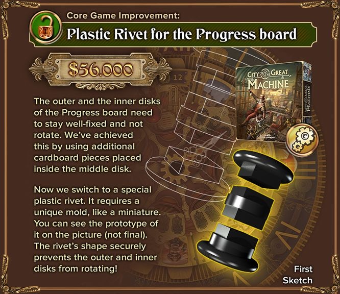 Le second est le rivet en plastique. Ok, vous pourriez penser qu’un petit morceau de plastique n’est pas si important que ça. Mais vous vous trompez ! Le tableau de progression de City of the Great Machine est l’un des éléments clés du jeu, et c’est la pièce avec laquelle vous allez interagir à chaque tour.