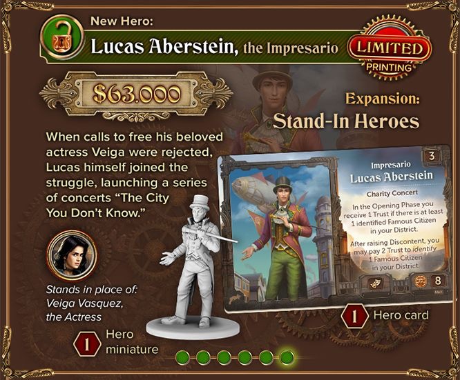 Lucas Aberstein, l’imprésario, fait partie de l’extension Stand-in Heroes, qui permet aux joueurs de remplacer les héros du jeu de base par de nouveaux héros. Que se passe-t-il si quelque chose arrive à l’un des six vaillants héros ? Y a-t-il quelqu’un qui rejoindra la cause et combattra la Machine s’ils échouent ? L’extension Stand-In Heroes répond à ces questions ! Dans une des prochaines Actu, nous en reparlerons.