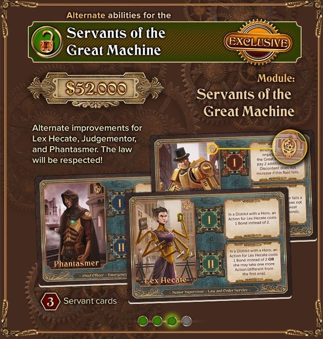 Le premier est quelque chose de spécial : Les capacités alternatives pour les serviteurs de la machine est un module exclusif à Kickstarter et sera inclus dans le pledge de Master of the City uniquement. Ces nouvelles capacités permettent à la Grande Machine de choisir entre deux ensembles d’améliorations pour chaque Serviteur avant la partie.