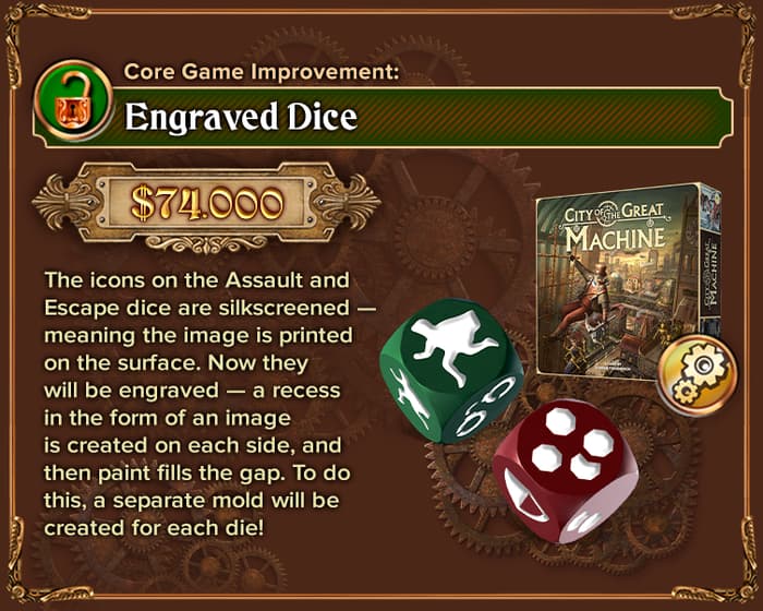 Mais d’abord, disons quelques mots sur le nouveau stretch goal débloqué : Dés gravés. Il s’agit d’une amélioration de base du jeu, elle affectera donc toutes les copies de City of the Great Machine, quel que soit le niveau d’engagement.