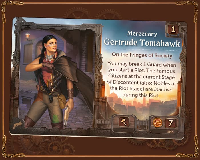 Gertrude se bat pour gagner sa vie, et elle le fait bien. Cependant, cela a un coût - il n’y a pas beaucoup d’affection dans la société pour les personnes qui tuent et meurent pour de l’argent. L’histoire de Gertrude réside dans sa capacité spéciale : lorsqu’elle déclenche une émeute, elle peut neutraliser un garde gratuitement, mais les méthodes dures qu’elle utilise effrayent ceux qui doutent, ce qui signifie que moins de citoyens sont disposés à se joindre à son émeute. Les citoyens célèbres au stade actuel du mécontentement (et les nobles au stade de l’émeute) comptent comme inactifs pendant cette émeute.
