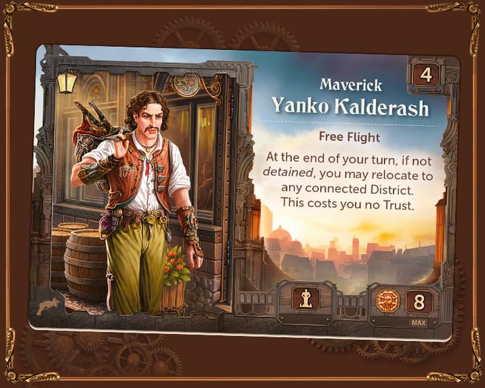 À l’aide de son planeur compact, Yanko peut se déplacer gratuitement dans n’importe quel District adjacent à la fin de son tour. De plus, il peut se glisser dans un quartier avec un jeton Raid sans être détenu ! Cette mobilité inégalée fait de lui un véritable casse-tête pour la Grande Machine, car il ne cesse de glisser entre ses doigts mécaniques.