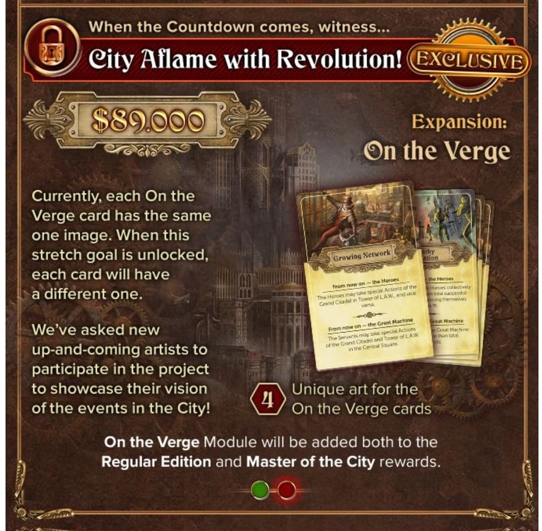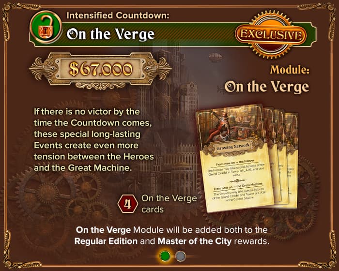 Le module On the Verge sera ajouté aux récompenses de l’édition standard et de Master of the City. Ce module se compose de 4 cartes Evénement de la Cité très spéciales, et chacune d’entre elles affecte grandement la fin de partie et crée encore plus de tension entre la Machine et les Révolutionnaires.