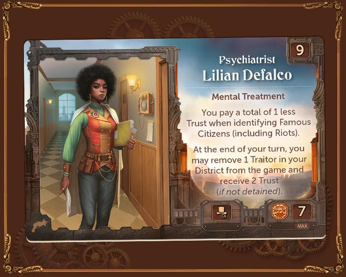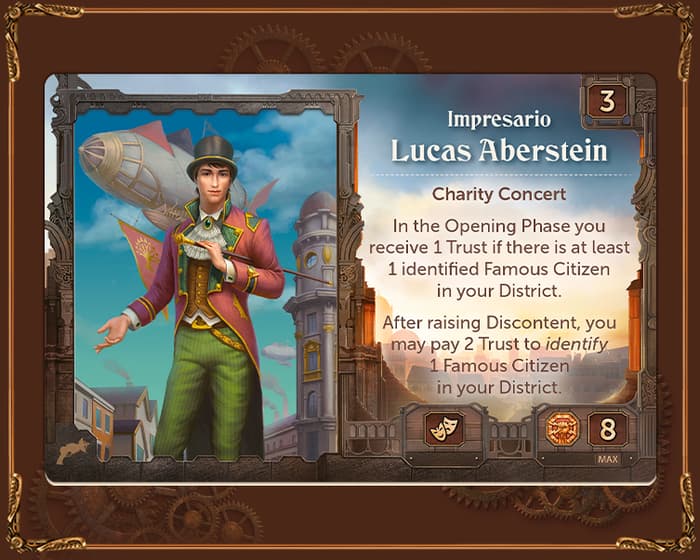En élevant le Mécontentement, Lucas peut identifier un citoyen célèbre, effectuant efficacement deux actions en un seul tour. Cela demande une Confiance supplémentaire… mais Lucas n’est pas étranger aux moyens de se procurer des ressources pour ses projets : il reçoit une Confiance supplémentaire lorsqu’il démarre un tour dans un Quartier avec des citoyens identifiés.