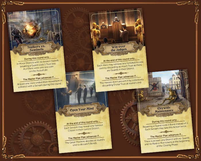 Une autre carte On the Verge permet aux Héros de ne pas payer de Confiance pour les citoyens qu’ils ne connaissent pas lorsqu’ils commencent une émeute (ce qui est un énorme avantage !) - mais s’ils échouent, le Plan Directeur avance de 2 au lieu de 1 (aïe !). Nos testeurs ont adoré cette carte, car ils y voient une grande opportunité pour les Héros de saisir la victoire d’un seul coup… et la même chose est vraie pour la Grande Machine, car les soi-disant « émeutes aveugles » mènent souvent à de misérables échecs grâce aux traîtres qui se cachent parmi les citoyens non identifiés !