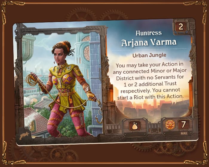 Les compétences extraordinaires d’Arjana lui permettent de se déplacer et d’agir comme aucun citadin ne peut le faire - et dans des endroits qu’aucune autre personne ne peut atteindre. En payant une confiance supplémentaire, Arjana peut effectuer une action dans n’importe quel district connecté comme si elle y était.