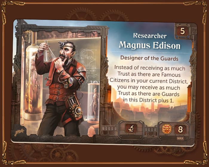 Lorsqu’il reçoit la Confiance au début du tour, Magnus peut choisir de recevoir la Confiance comme d’habitude du Citoyen célèbre, ou de recevoir autant de Confiance qu’il y a de Gardes dans son District plus 1. Cela signifie que la plupart du temps Magnus aura suffisamment de ressources pour agir, même s’il commence la manche en partageant le District avec un autre Héros.