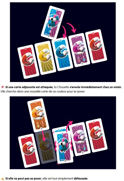 Elles vont faire partie des cartes ‹ equipements ›. Elle se pose sur une carte aimant en jeu, augmente l’aimant sur lequel elle se pose de 1. Vaut 1 +2 en fin de partie si elle est toujours là. La particularité c’est que si une carte voisine de la chouette se fait éjectée, la chouette s’en va (defaussee)