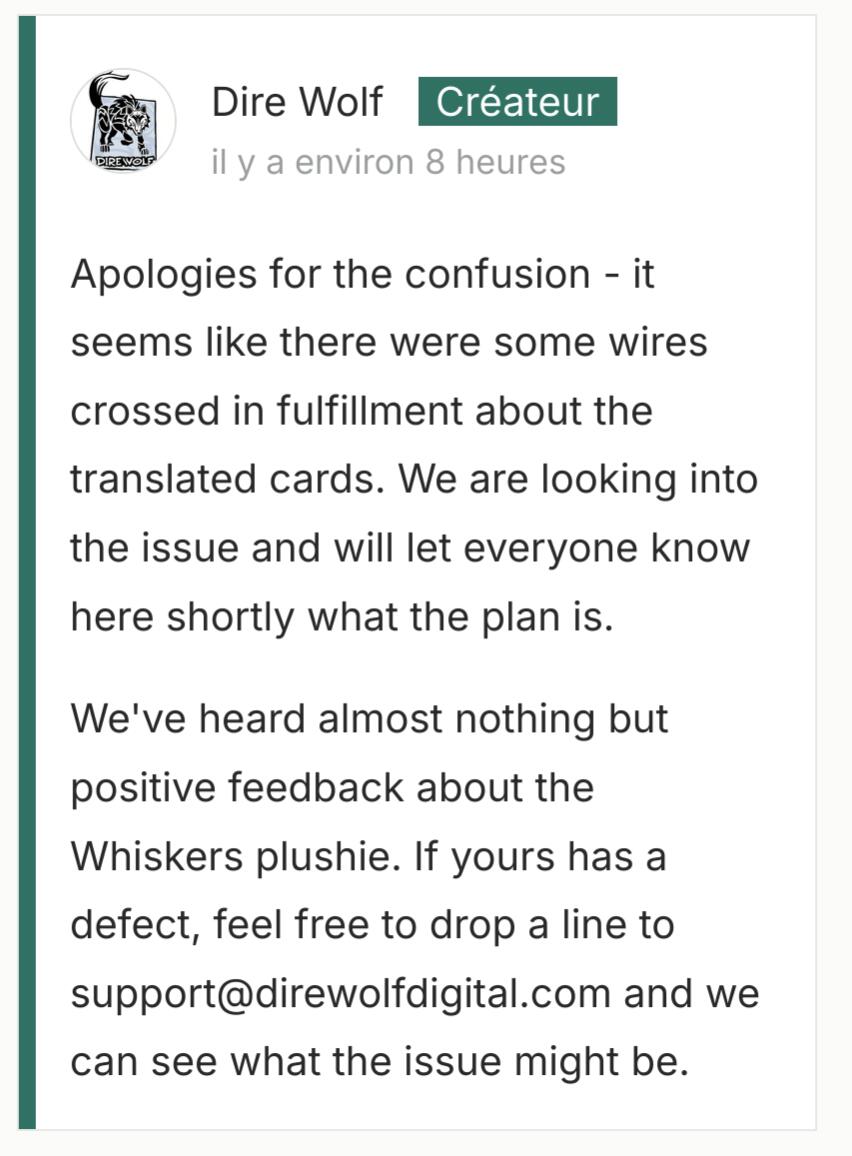 Côté Origames, ils réindiquent que c’est Dire Wolf qui a tout géré.