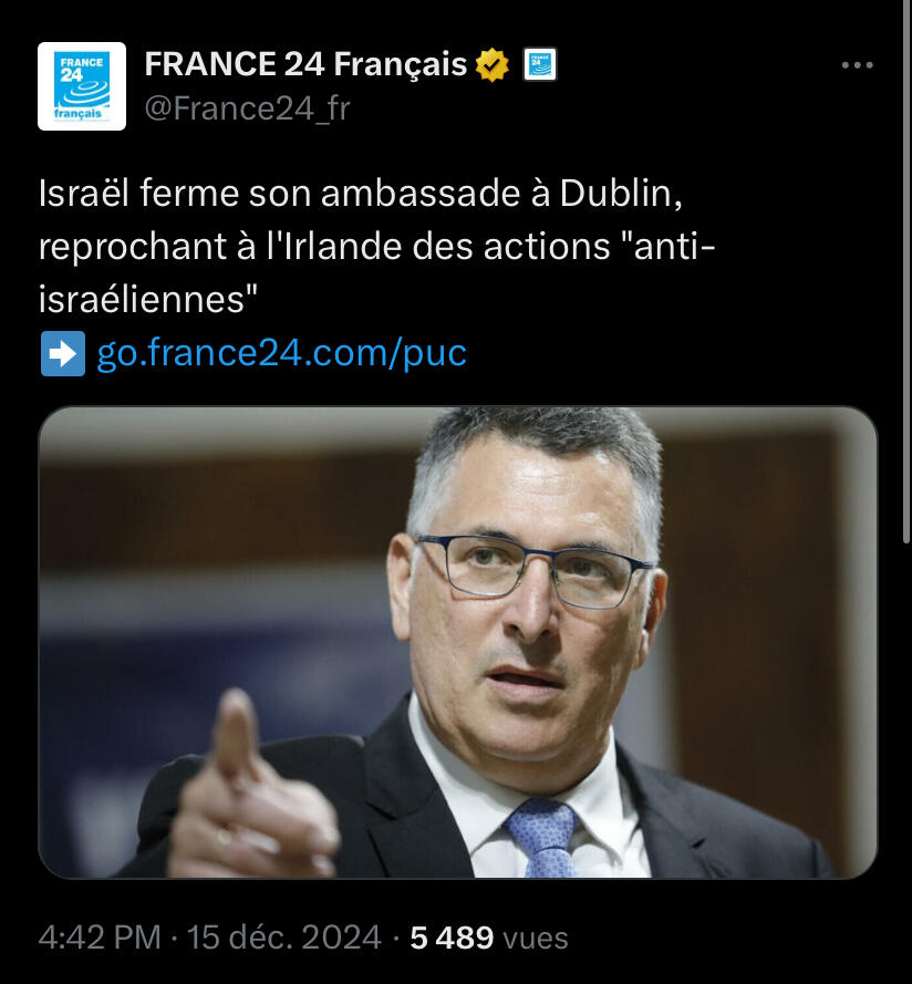 Israël a indiqué dimanche avoir ordonné la fermeture de son ambassade à Dublin, reprochant à l’Irlande ses « actions et [sa] rhétorique antisémite ». Le Premier ministre irlandais Simon Harris a réagi en rejetant « totalement l’affirmation selon laquelle l’Irlande est anti-israélienne », insistant que son pays « est pour la paix, pour les droits humains et pour le droit international ».