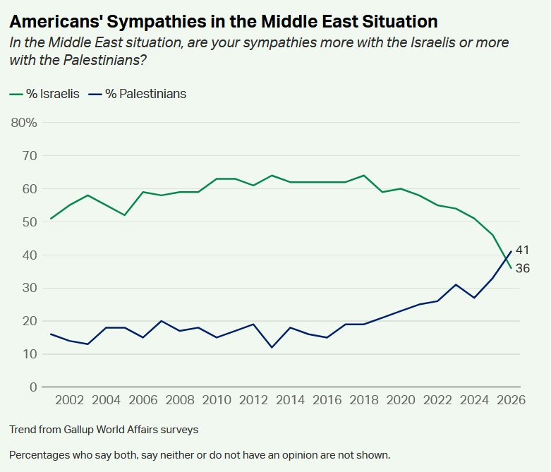 Pour la première fois depuis que ce sondage existe (2002 il me semble), les américains éprouvent plus de sympathie pour la Palestine que pour Israël. (Sondage réalisé avant la guerre contre l’Iran)